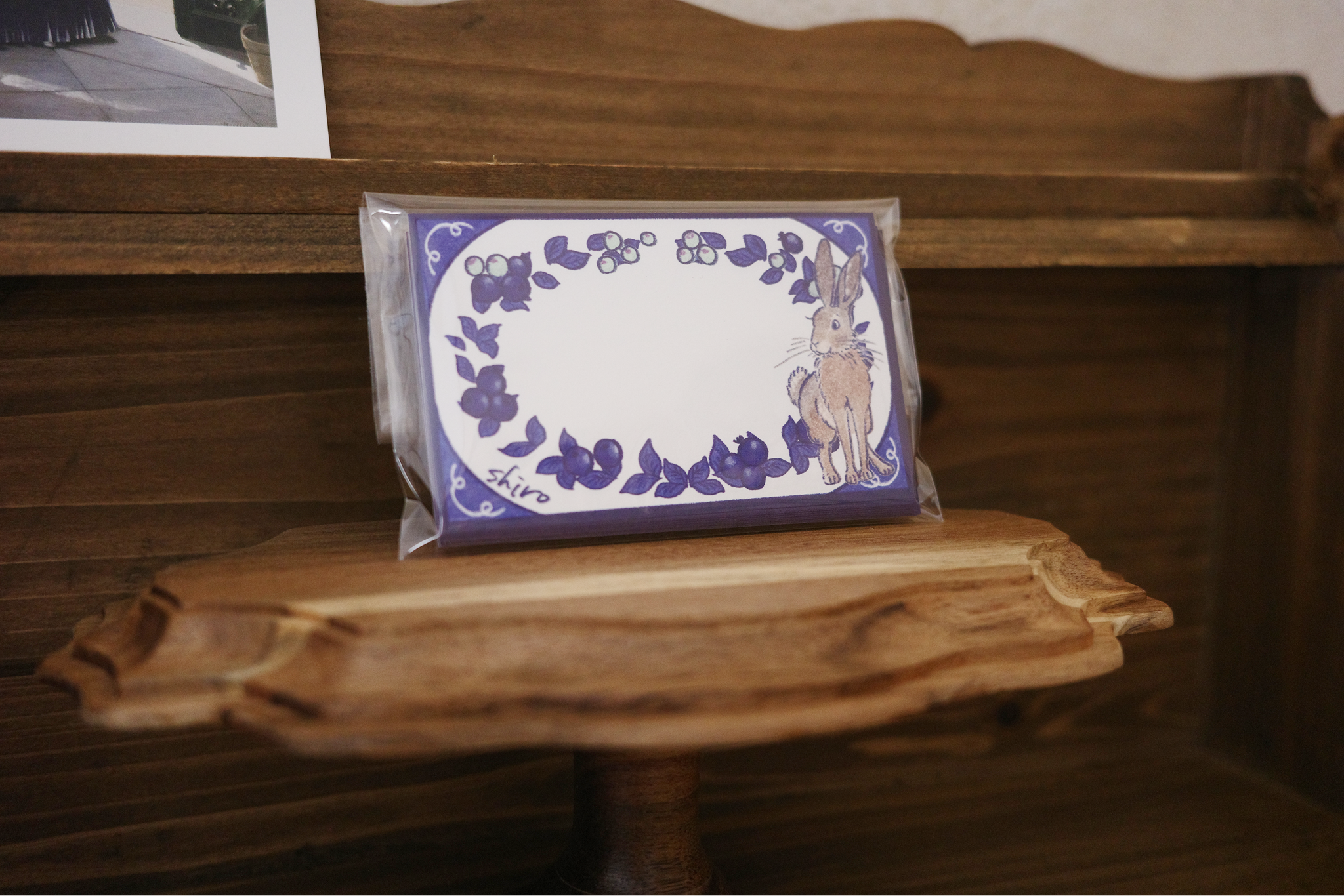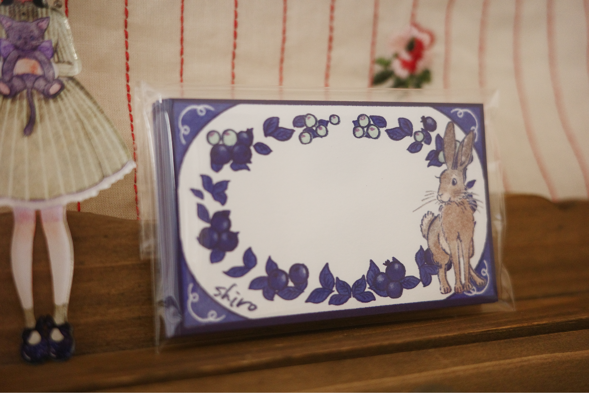 名刺サイズ(91mm×55mm)のこのミニメモは、北欧フィンランドをテーマにした美しいブルーベリーシリーズの絵柄が施されています。さらに、愛らしいヨーロッパ野ウサギのモチーフが印象的で、おしゃれなデザインを楽しめます。ちょっとしたお礼やメッセージを残したい時に、名刺入れや財布に忍ばせて活用してください。